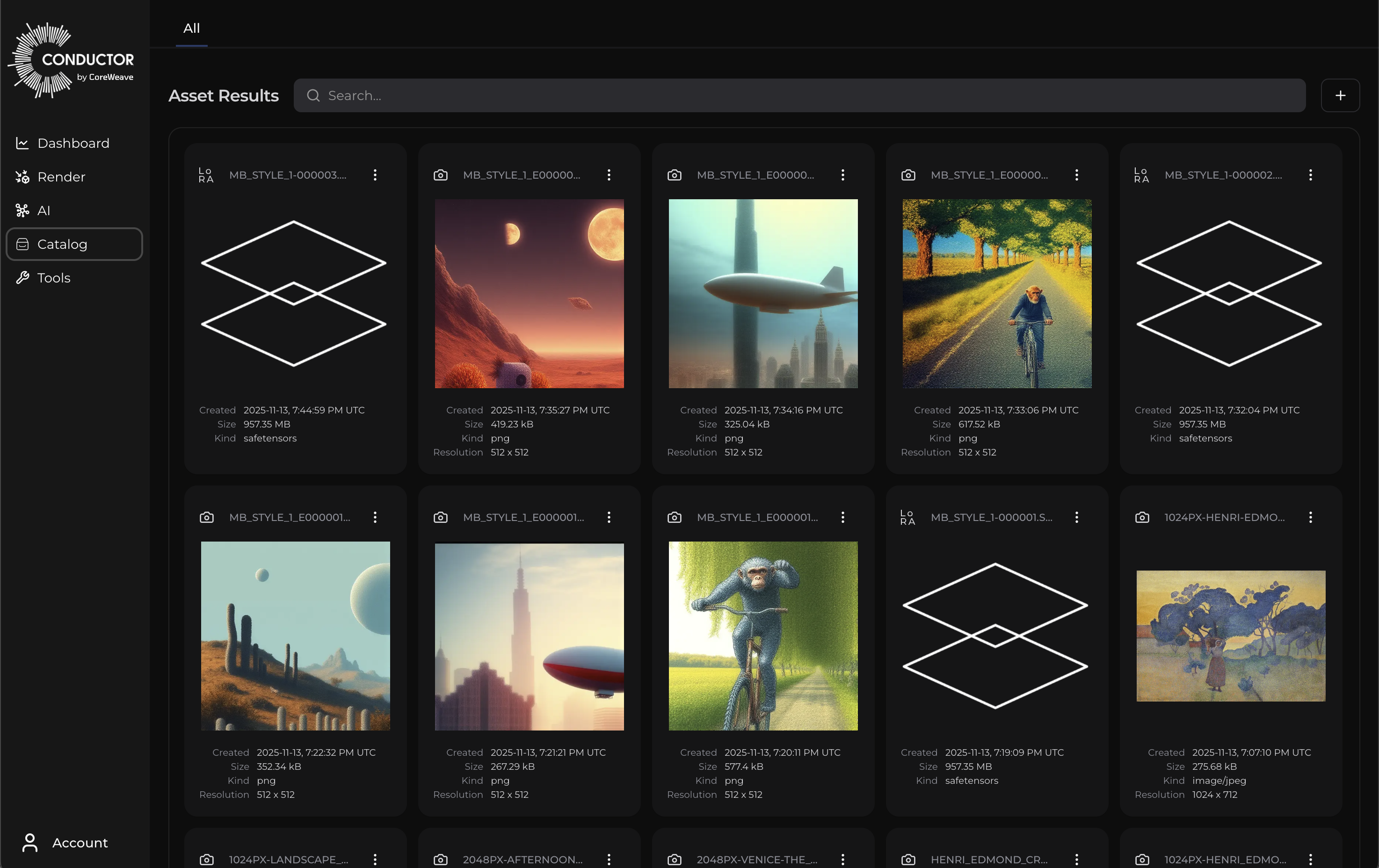 The Catalog provides a view into all of the assets that your organization has uploaded or generated. Assets that are used as training data, or output generated by a training or inference job will be automatically added to your catalog.
