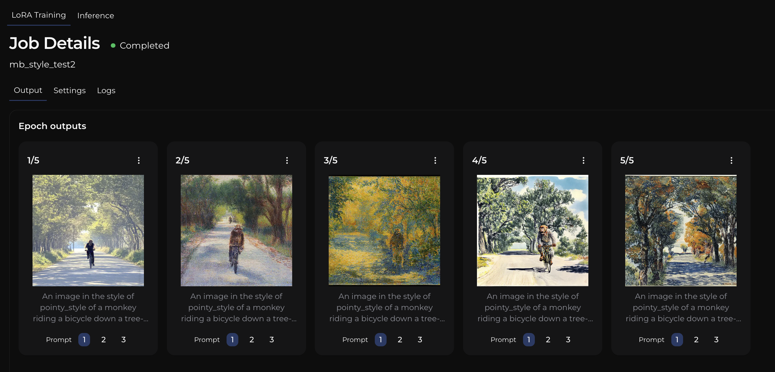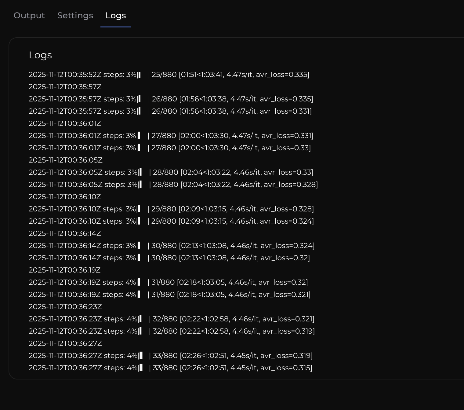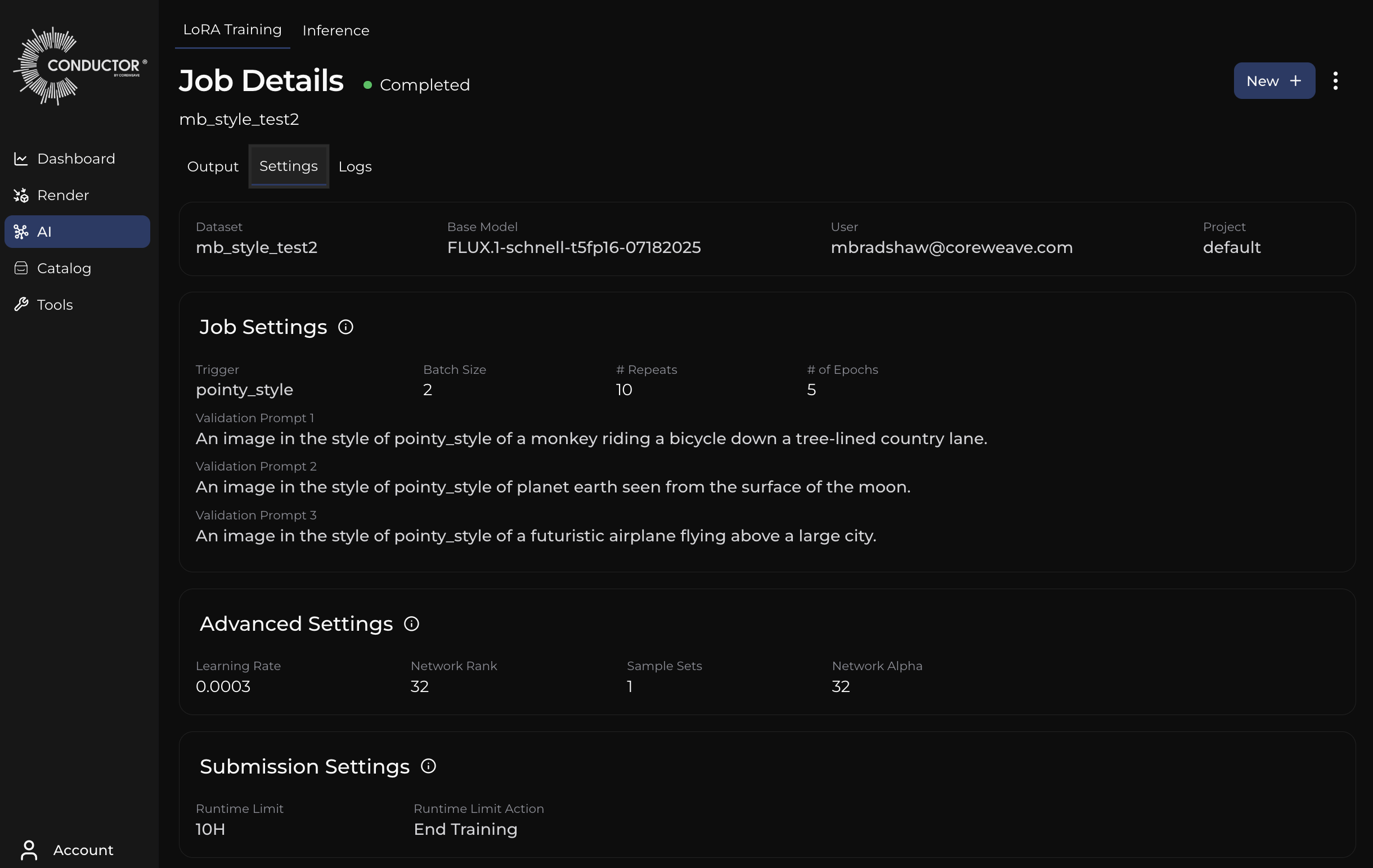 The Job Details page will give you all of the relevant information for a specific LoRA Training job. There are three tabs on the Output Page; Output, Settings, and Logs.
