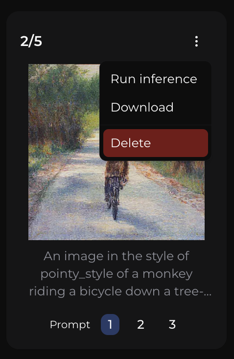 | Run Inference | Create a new inference job, pre-populated with the settings to use the safetensor from this Sample Set. |